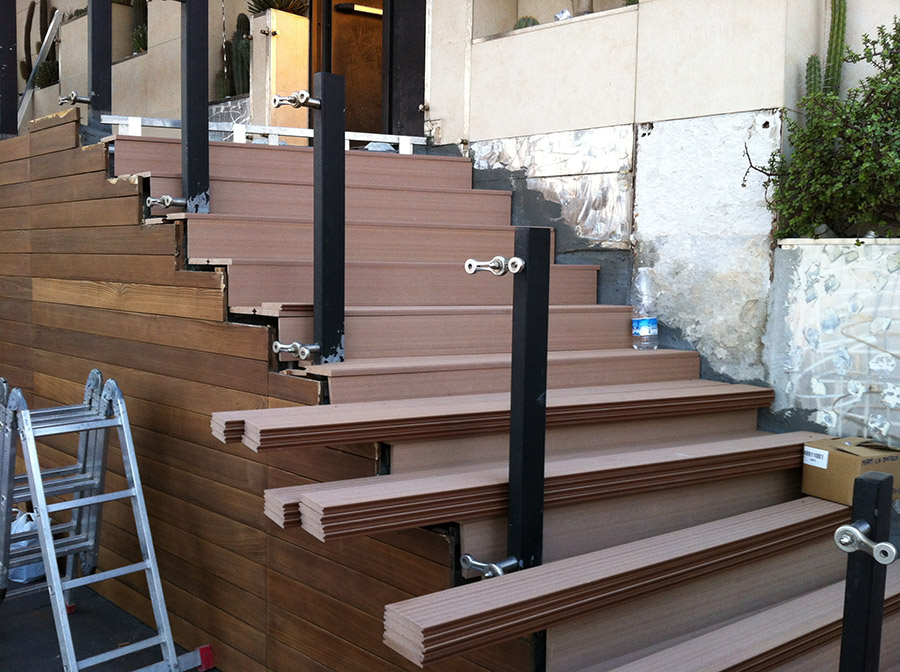 Posa in opera su struttura di acciaio a sbalzo di Parquet per esterno .