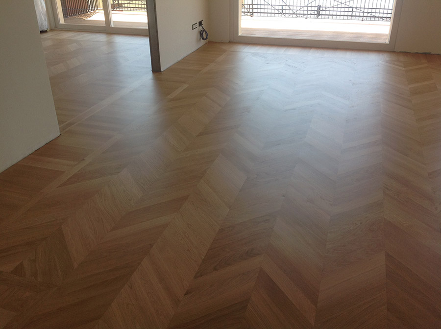 Posa in opera di Lamparquet di Rovere a spina francese con fascia e bindello e con finitura Oleouretanica Satinata.